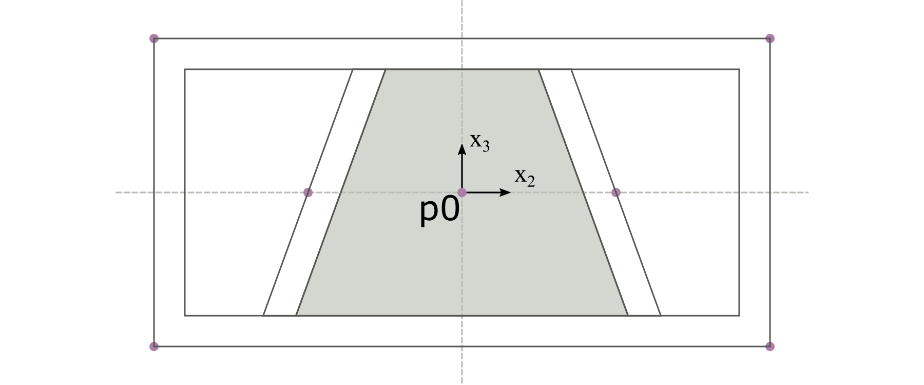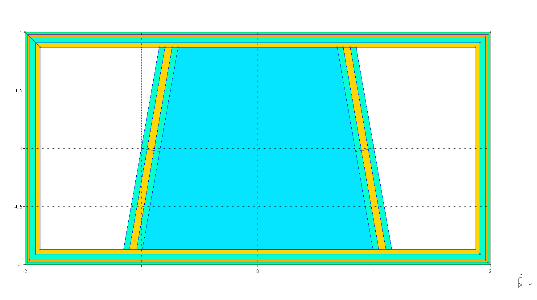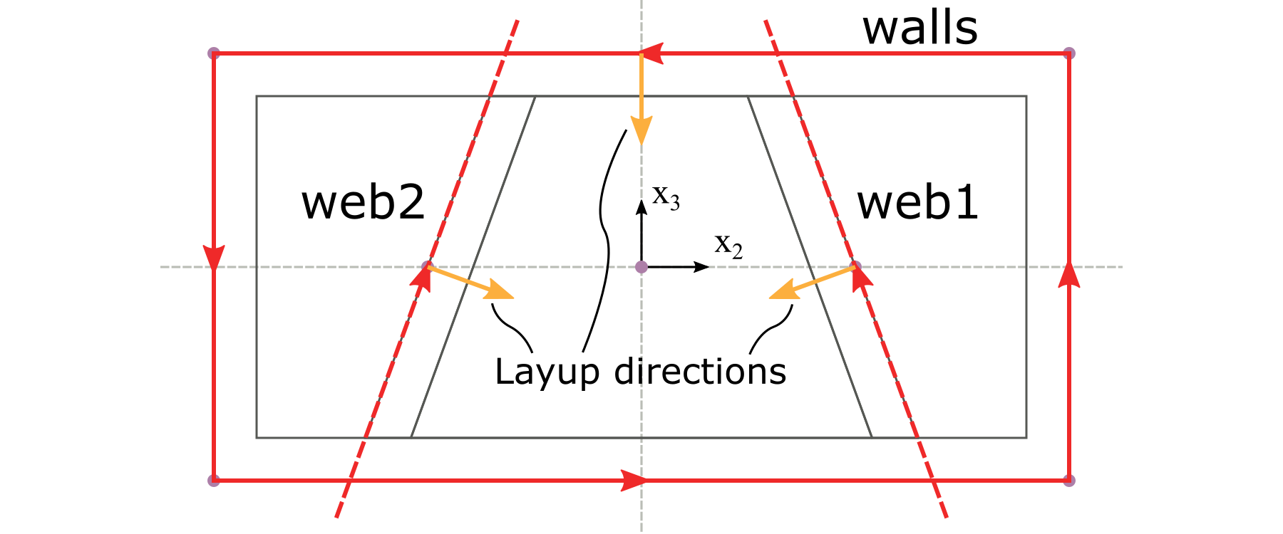 The box-beam cross section shown in Fig. 8 will be used in this tutorial. All four walls and two webs are made from composite laminates. The two webs are symmetric about a middle vertical line. They are inclined such that the upper portion of both webs are closer to each other than the lower portion. The central space enclosed by the top and bottom walls and two webs is filled with an isotropic material.