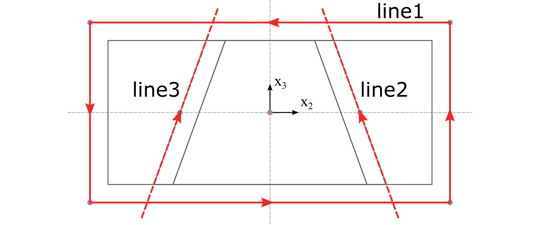 Base lines are created based on key points defined above. As shown in Fig. 11, three lines are created. Line 1 is defined by connecting the four points (p1 -> p2 -> p3 -> p4 -> p1). Line 2 and 3 are defined by a single point with an incline angle. For line 2, it is the point p5 with an angle of 100 degrees. For line 3, it is the point p6 with an angle of 80 degrees.